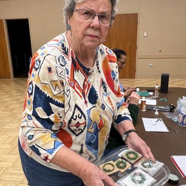 Christmas Wreath Project taught by Karen Hochradel. Karen brought holly leaves and berries (beads) to decorate the wreaths.