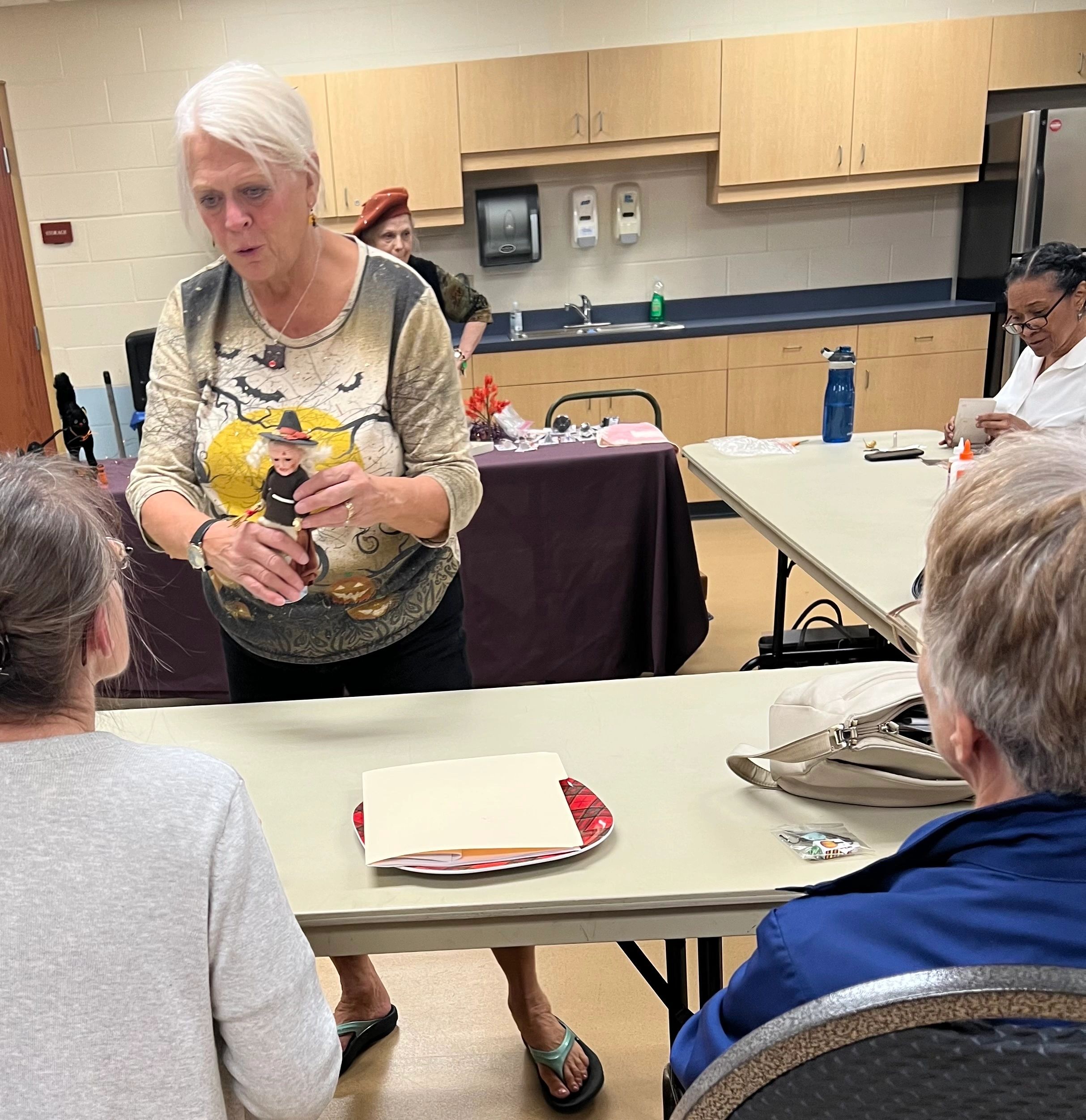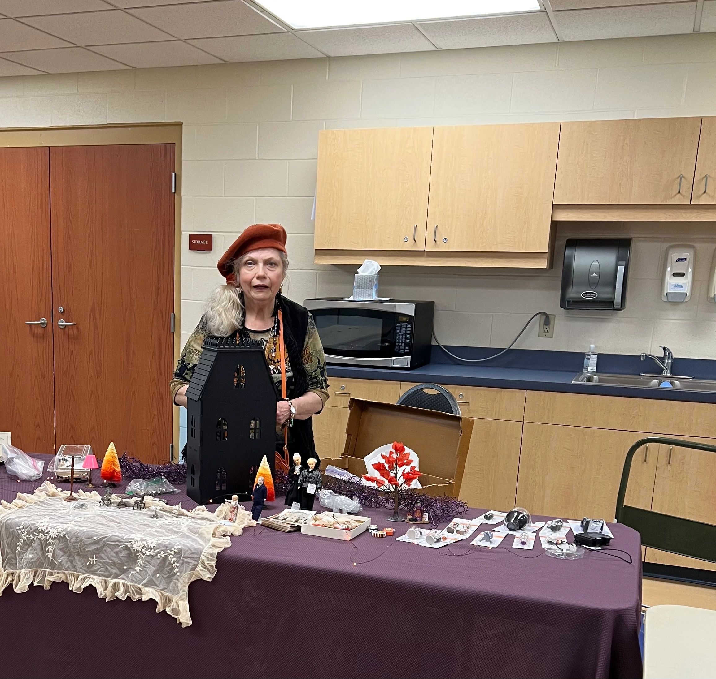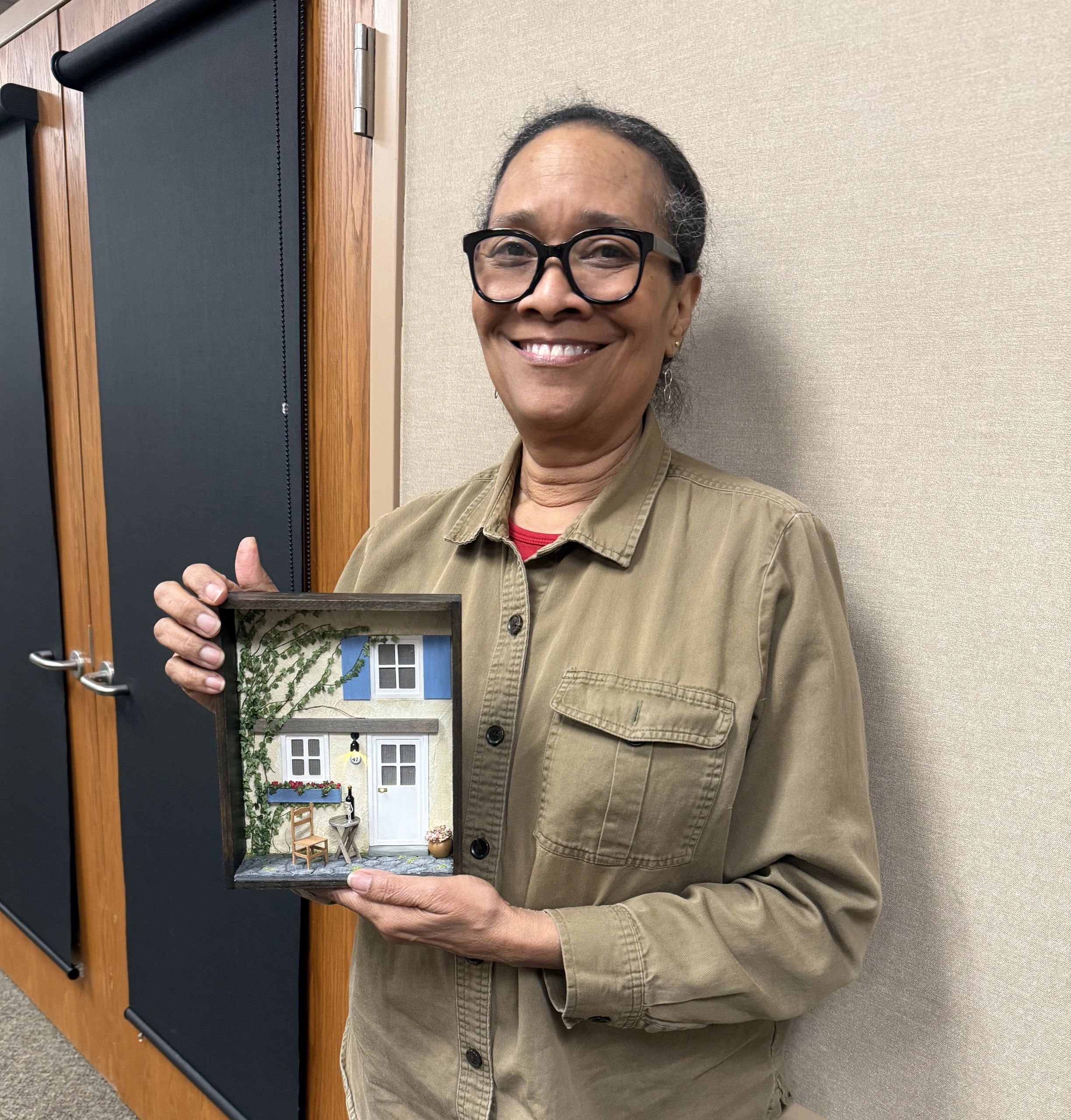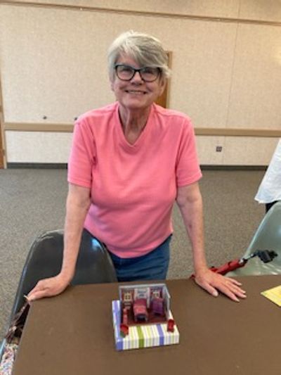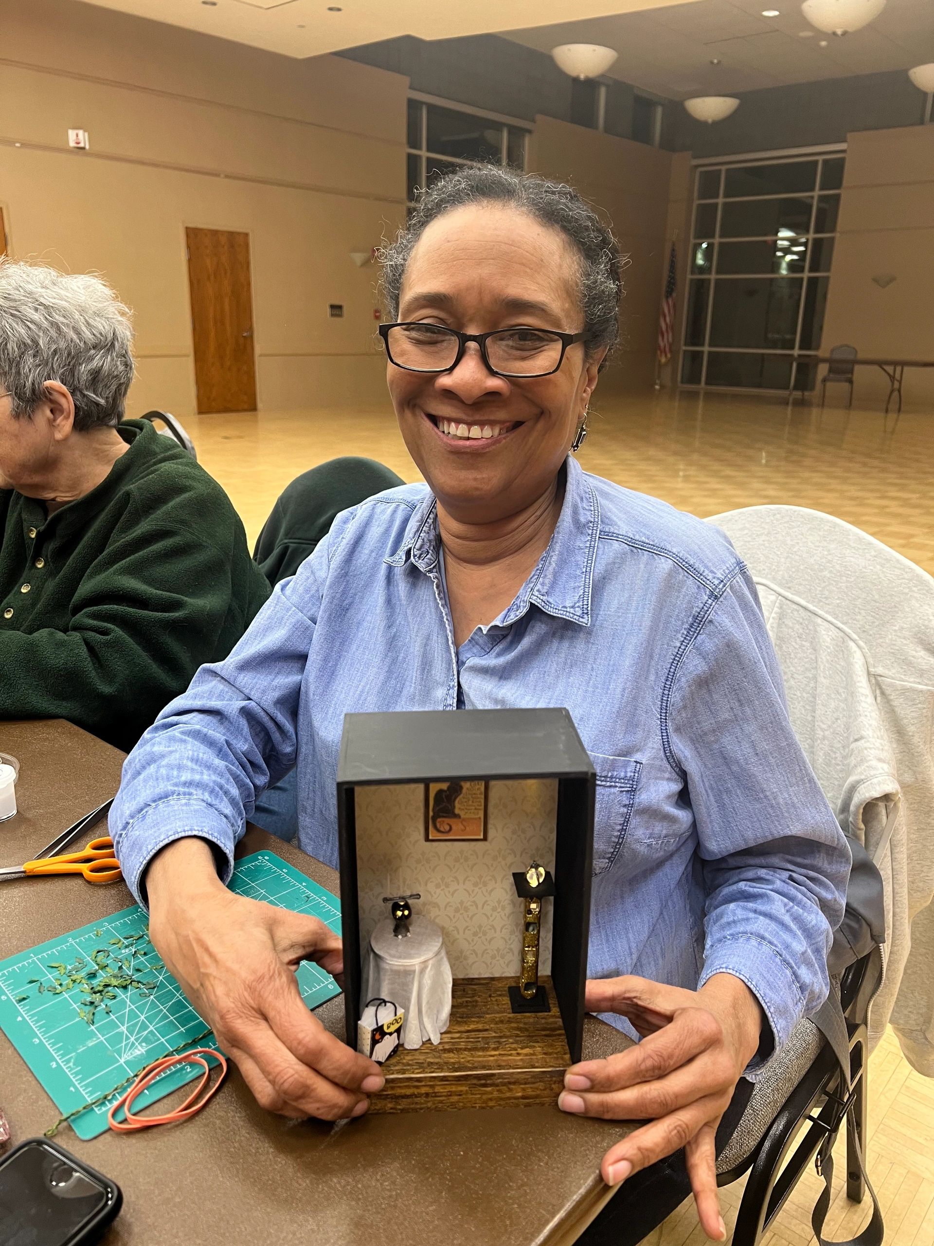 Nati brought her completed porch to the October meeting. She is the first one to complete the porch project that we started in February, 2024. She already had the room box in her stash and completed it with some of the projects we've done this past year. It also has an electric light over the front door! Great job!