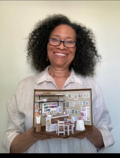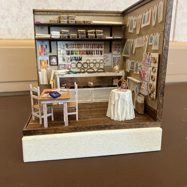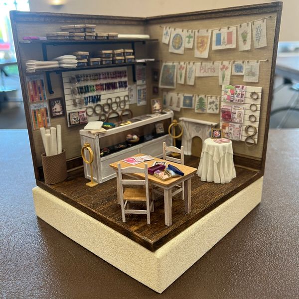 The French Needlework Shop was created as a remembrance of my time studying in Dijon, France. Tucked away on a side street I found a small needlework shop where I bought canvas and thread to keep my hands busy during quiet times. Everything in my half-scale shop was hand-crafted by me. I love the challenge of finding a way to replicate a life-size object in a small scale. I found inspiration in a local needlework shop that is charmingly styled with canvases, threads, and even a faux fireplace. I used vintage handkerchiefs to make rolls of canvas, printed canvases, and the tablecloth. The bolts of canvas on the shelf are made of organza gift bags. Each spool for embroidery floss was hand cut from card stock. Miniature floss was made from actual floss untwisted to a single thread and wound around a spool or hung on the display rack. Bags of blank spools were encased in cellophane. A vintage display case found on an online auction site was the model for my half-scale piece. The silver scissors were made from wire harvested from twist ties. I used copper wire from electrical cord for the brass scissors. The magazine and book covers are of French publications. The embroidery hoops are either of wood or card stock. I have named this work L’Aiguille Française - The French Needle